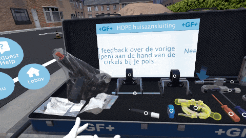 In many today’s virtual reality (VR) trainings such a technique is not applied. Additional cues such as highlights or arrows pointing to the right tools, materials or target actions—academically referred to as signaling—usually appear at the start of a new step and are presented together with textual or spoken instructions. This allows a trainee to walz through the training, but what they are actually doing is blindly grabbing, placing, and handling whatever the VR environment conveniently highlights. This is exactly what we found possible in trainings that we tried out and wanted to improve at the start of our collaborative TETRA project ExperienceTwin, together with Georg Fischer Piping Systems and SupportSquare.